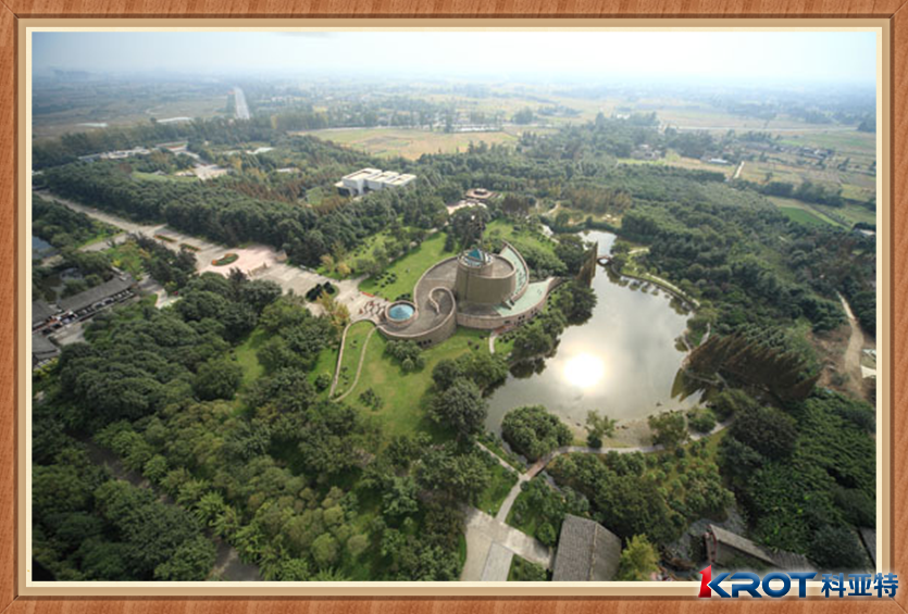 三星堆博物馆占地面积约33公顷,绿化面积达80%以上,馆区内环境优美、布局动静得宜,曲径敞道,垂柳依依、古蜀奇葩、湖光岛影无处不体现了人文与自然完美结合、飘逸自然、浑然天成的川西园林特色。博物馆主体建筑外形追求与地貌、史迹及文物造型艺术相结合的神韵,融原始意味和现代气息为一体。一展馆建筑为半弧形斜坡生态式建筑,张扬人与自然和谐共生的人文精神,二展馆建筑为三部一体的变形螺旋式建筑,其整体具有“堆列三星”与“人类历史演进历程”的双重象征,馆外还有气势灰宏的仿古祭祀台和供现代文体活动的大型表演场与展馆建筑遥相呼应,表达了三星堆文化苍古雄浑、博大精深的历史意蕴。
